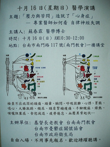 主題:「壓力與苦悶」造就了「心身症」~ 專業醫師如何看、自律神經失調 主講人: 蘇春霖 醫學博士 時間: 十月16 日(日) AM10:30~12:00 地點: 台南市南門路117 號(南門教會)一樓講堂